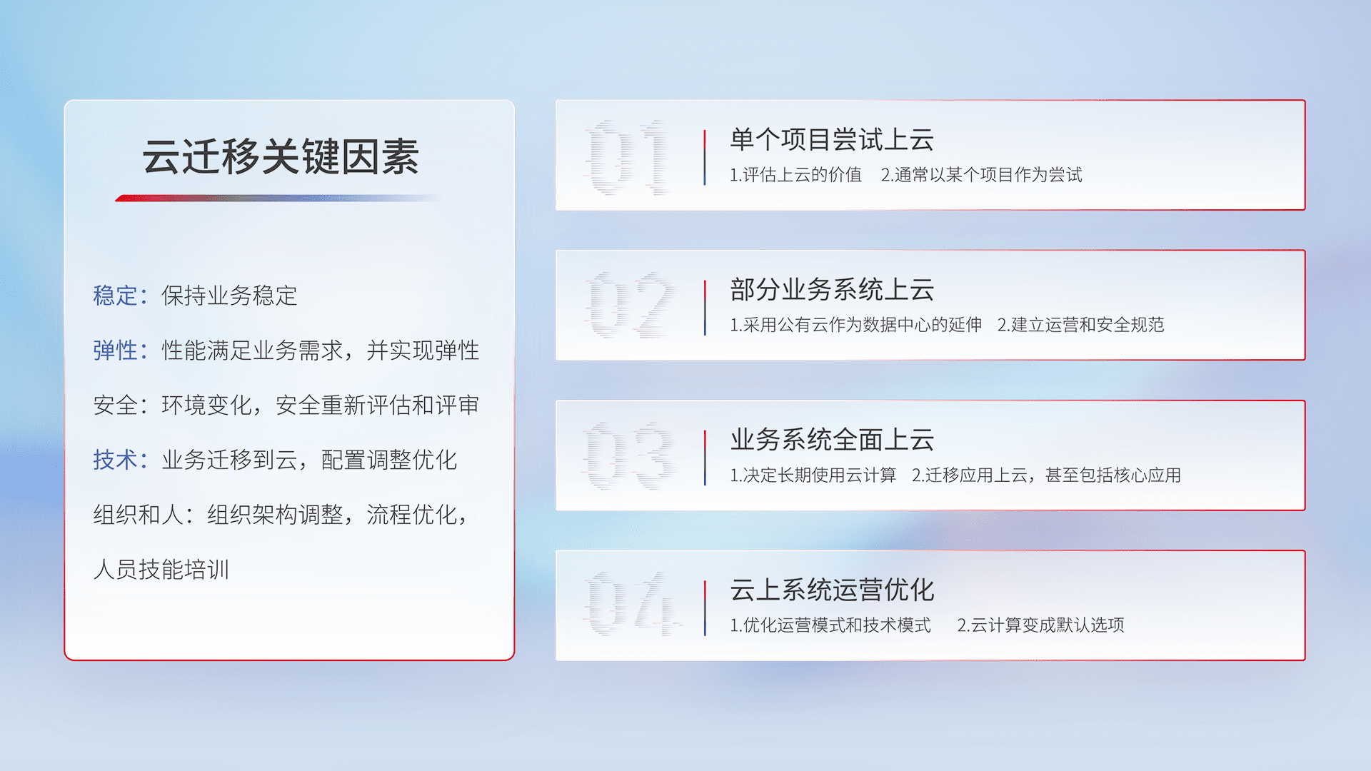 结合实际业务,,,,从规划设计、、、、云平台选型、、、云原生改造、、、、数据迁移、、集成交付,,迁移全过程为客户识别最佳上云路径,,,做好风险识别管理,,设计网络架构、、、身份权限、、安全审计合规、、、操作审计、、、日志审计、、、、监控告警策略、、多站点容灾设计等,,,对云上基础设施进行整体规划,,,提升IT治理水平,,,,以满足弹性、、、高可用、、、高性能的需求。。。
