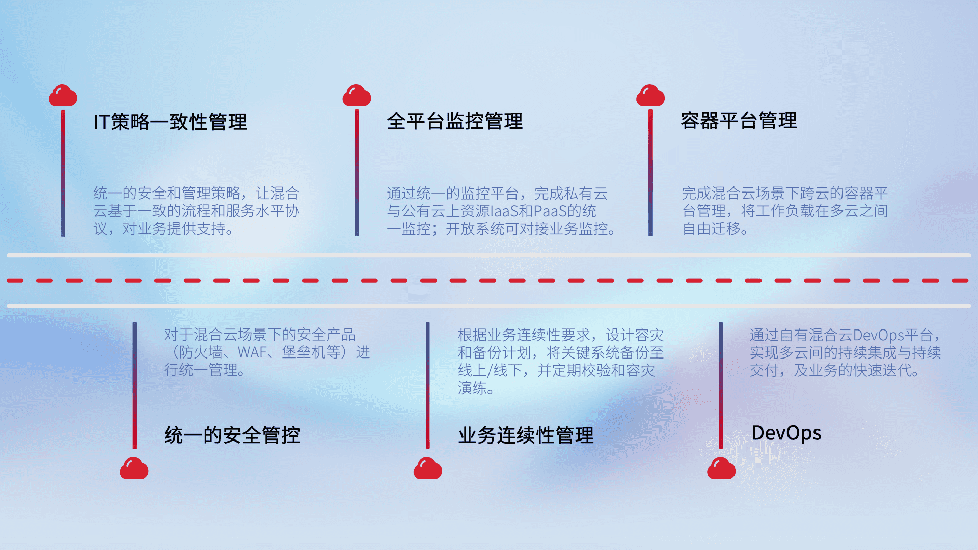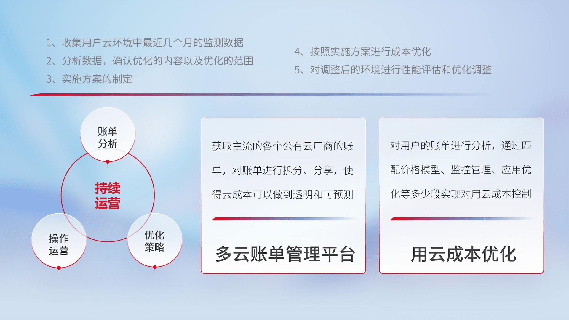 通过多云纳管,,,以统一的资源数据模型把客户的云资源进行抽象和封装,,进而实现对多云资源的统一操作,,,保障云资源管理的可靠性、、、、稳定性与可用性。。量身定制化运维内容,,,配置、、、、开发运维、、、补丁管理、、、、备份、、监控、、、认证和访问管理、、、审计和日常巡检等,,,,保障在用云过程中的可靠度,,稳定度以及高可用率。。。