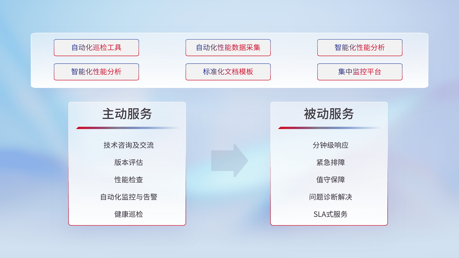 智能化工具和标准化文档,,,保障服务质量,,提供主动服务(包含技术咨询、、、版本评估、、、性能检查、、、自动化监控与告警、、、、健康巡检)和被动服务包含(分钟级响应、、、、紧急排障、、值守保障、、、问题诊断解决、、、、SLA服务)。。。。