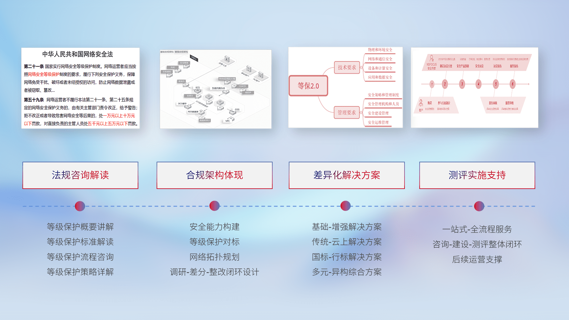 通过专业的法律咨询解读、、合规架构体现、、、、差异化解决方案、、、、测试实施支持等服务,,,为客户量身打造等保合规体系。。